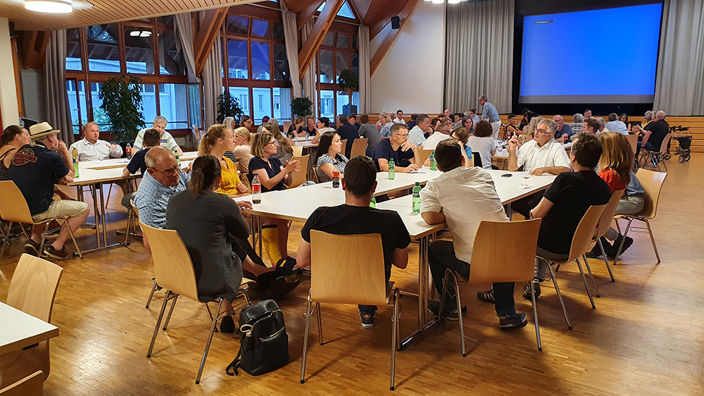 Draussen ist es hochsommerlich warm. «Wie viele Personen werden an diesem Abend kommen?» Leichte Sorge schwingt beim Gemeindepräsidenten mit. Doch unbegründet. Die Plätze an den Tischgruppen im Aaresaal des Dorfzentrums füllen sich. Um sieben eröffnet Benjamin Marti den Abend. Im ersten Teil erfolgen Hintergrundinformationen, gefolgt vom Austausch in Kleingruppen.