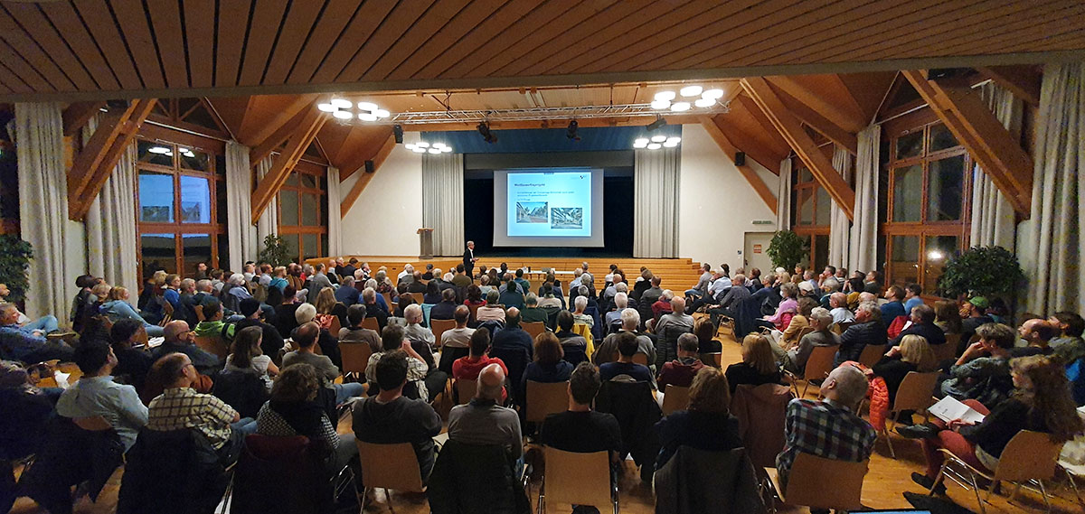 Am 1. November 2022 begrüsst der Gemeindepräsident Benjamin Marti fast 200 Interessierte zur Informationsveranstaltung. Es geht um die Ortsplanungsrevision und den Projektierungskredit für die Schulanlage Mühlematt.